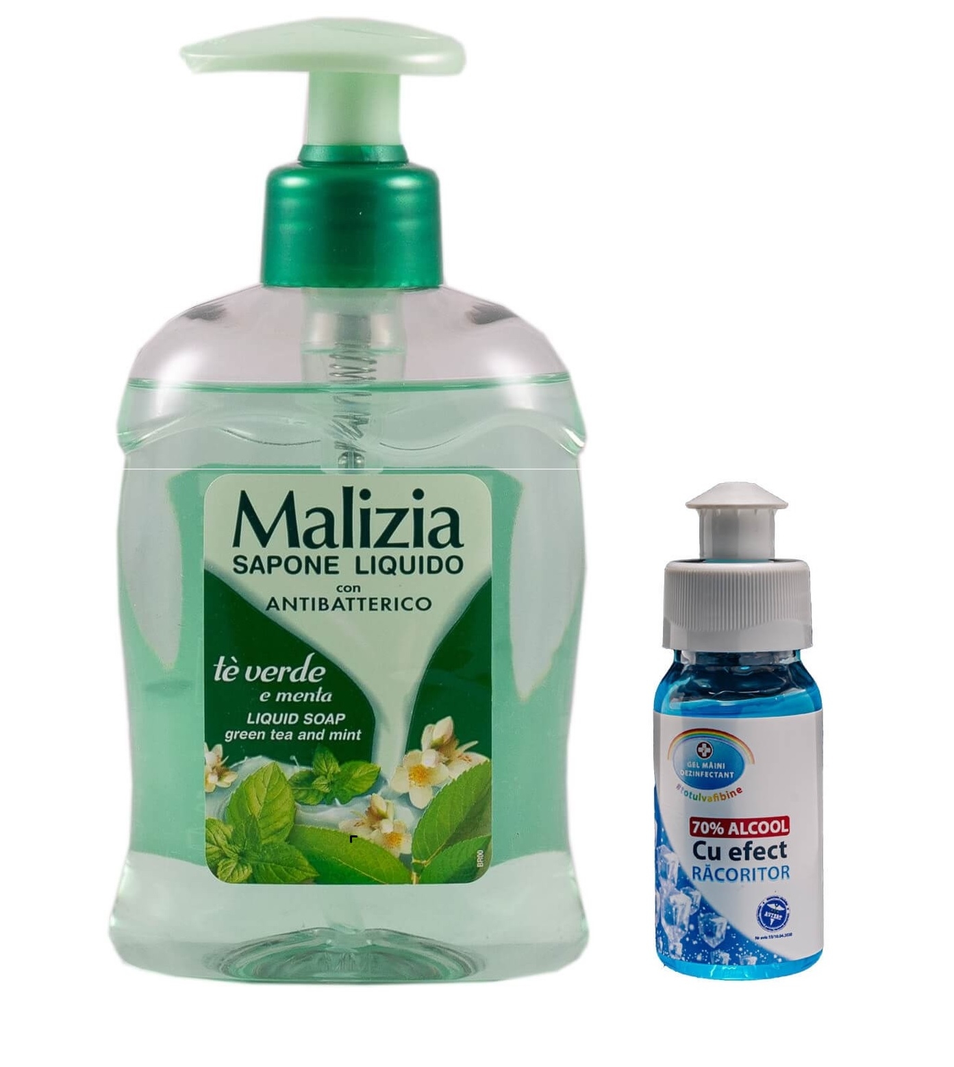 Pachet Lebada Gel dezinfectant pentru maini racoritor 70% alcool, 50 ml si Malizia Sapun lichid antibacterian ceai verde si menta, 300 ml