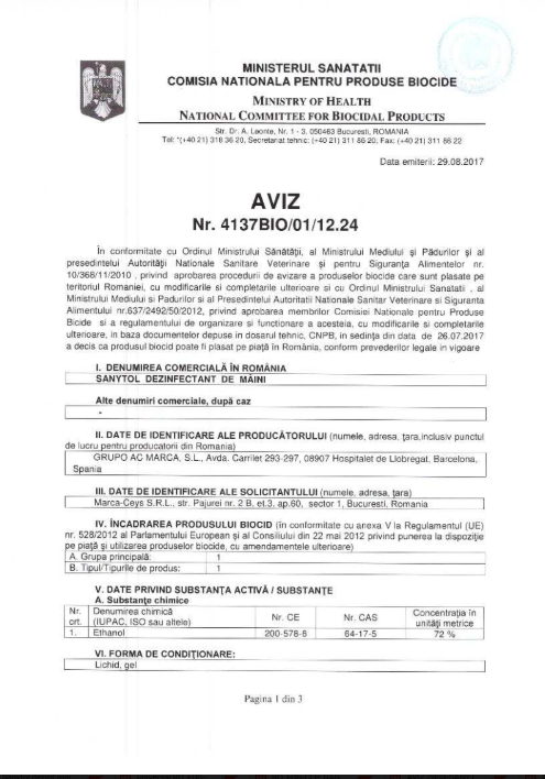 TP1: Produsele din această categorie sunt produse biocide utilizate pentru igiena umană, aplicate pe sau care intră în contact cu pielea umană sau cu pielea capului în scopul principal de a dezinfecta pielea sau pielea capului.