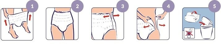 Indicatorul de umiditate ofera informatii despre necesitatea schimbarii produsului, iar inscriptia „FRONT” indica partea din fata a chilotului.