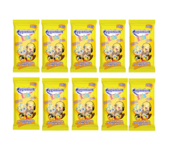 Pachetul contine: 10 pachete Servetele umede igienizante Hygienium pentru copii, 24 buc/pachet, fara alcool, Yellow