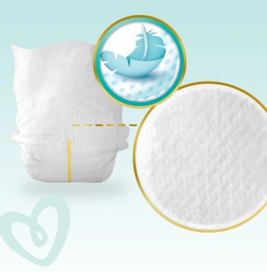Stratul superior, exclusiv Pampers permite patrunderea aerului si ofera confort pielii bebelusului tau, in timp ce tine departe umezeala si murdaria pentru a preveni iritatia pielii.