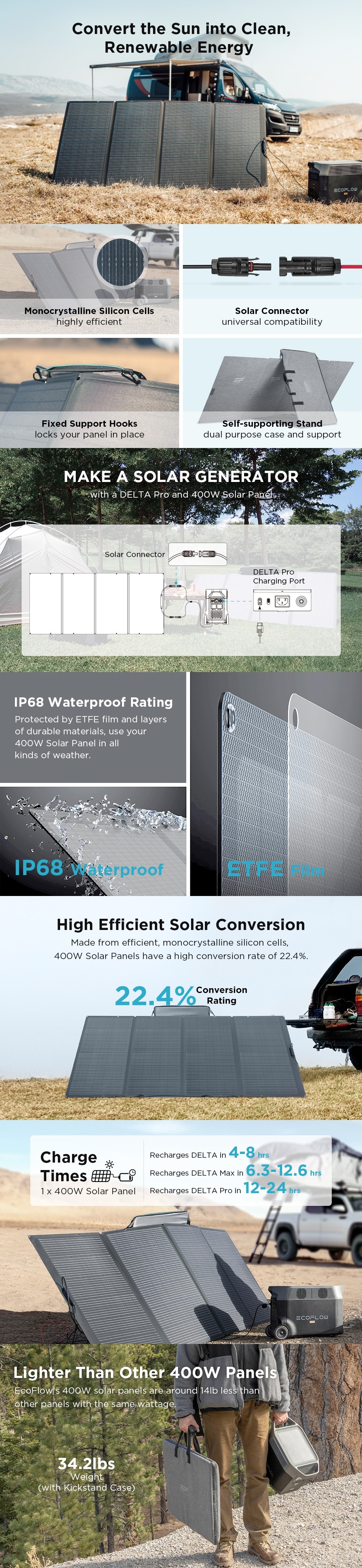 Atunci cand este asociat cu o statie de alimentare EcoFlow, panoul solar de 400W utilizeaza algoritmul MPPT pentru a obtine o eficienta optima pe timp de ploaie sau de soare. In ceea ce priveste panourile solare, rata sa de conversie de 22,4% este uimitoare.