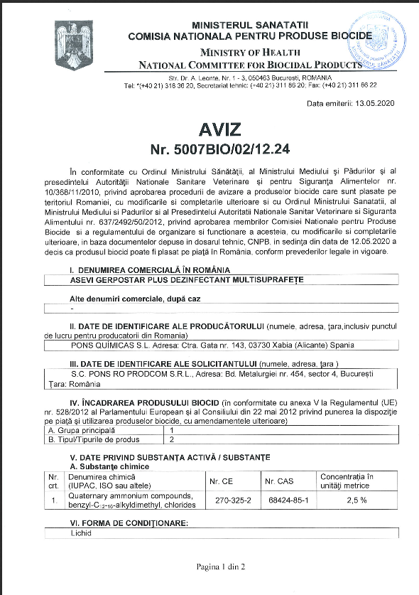 Asevi dezinfectant a fost conceput in conformitate cu standardele inpuse de Ministerul Sanatatii, mai exact a Comisiei Nationale de Produse Biocide, astfel ca utilizarea sa nu impune niciun risc. Important este insa ca dumneavoastra sa aveti grija atunci cand folositi astfel de produse, pentru ca ele sa nu intre in contact cu ochii, pentru ca totusi sunt compusi chimici, si nici sa nu le lasati la indemna copiilor. De aceea, noi va atentionam de fiecare data sa le utilizați în siguranță produsele biocide si sa citiți întotdeauna eticheta și informațiile despre produs înainte de utilizare.