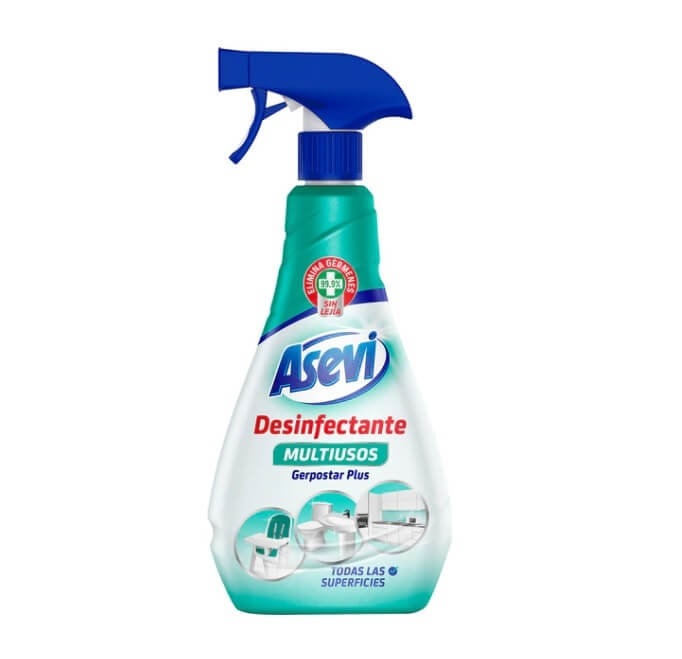 Asevi Dezinfectant este o solutie  ideala de curatat si dezinfectat suprafete. Aceasta combina o mare putere de curatare cu maxima eficienta bactericida, eliminand 99,9% din germeni si bacterii.  Asevi dezinfectant este recomandata pentru orice tip de suprafete, inclusiv pentru dezinfectarea meselor de lucru, chiuvete, obiecte sanitare, cabine de dus, interior si exterior electrodomestice, obiecte bebelusi (jucarii, masute). Are o textura lichida, ceea ce face procesul de aplicare usor si simplu. Dezinfectant Asevi multisuprafete vine intr-un recipient de 750 ml si este prevazut cu pulverizator ceea ce-l face foarte practic, usor de utilizat si la indemana oricui. Printr-o simpla pulverizare, reusesti sa scapi de microbii existenti. Produsul se pulverizeaza uniform pe suprafete, iar dupa aproximativ 5-10 minute, timp in care a actionat, suprafata este corespunzatoare, din punct de vedere igienic, utilizarii. In cazul suprafetelor foarte murdare, se recomanda mai intai curatarea suprafetei cu un detergent obisnuit si dupa aceea dezinfectia suprafetei.