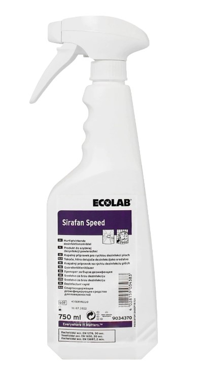 Sirafan Speed este un dezinfectant lichid rapid, gata de utilizare fara clatire, cu spectru larg de eficacitate impotriva bacteriilor, fungilor, si virusurilor incapsulate. Actiunea sinergica a ingredientelor active furnizeaza o dezinfectie rapida a tuturor suprafetelor care intra in contact cu alimentele, cum sunt mesele de preparare, masinile de taiat si de feliat. Nu necesita clatire. Bactericid conform EN 1276, levuricid conform EN 1650, bactericid si fungicid conform EN 13697, eficace impotriva virusurilor incapsulate (BVDV, Vaccinia).