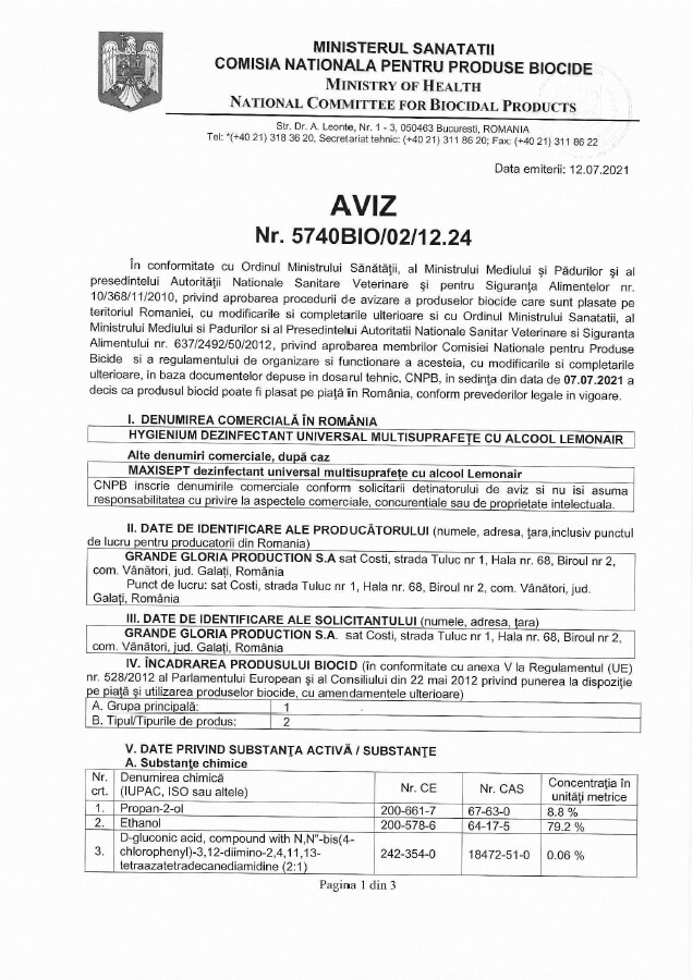 | Proprietati | Dezinfectant |