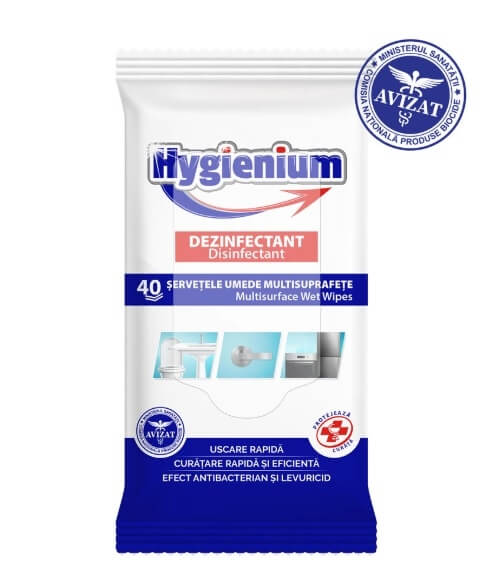 Hygienium servetele umede dezinfectante pentru suprafete multiple, fara clor. Servetelele umede omoara bacteriile si igienizeaza rapid suprafetele.