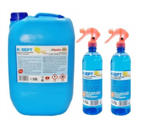 K-sept Virucid dezinfectant suprafete 10L + K-Sept Dezinfectant suprafete pe baza de alcool 75% cu pulverizator, 2 buc x 750 ml