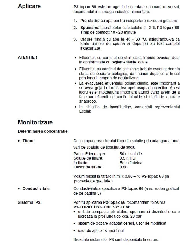 Topax Ecolab este un detergent dezinfectant si degresant activ care omoara microbii, bacteriile si germenii cu rapiditate. Textura sa este una lichida, alcalina, iar în compozitia sa s-a utilizat si clor activ, ceea ce denota faptul ca produsul Topax 66 ecolab are o eficienta rapida si de durata, putand fi folosit fara nici o grija, ba din contra fiind chiar recomandat/ special conceput pentru curatarea si igienizarea suprafetelor din industria alimentara. Produsul P3 topax 66 are un efect real de combatere a micro-organismelor in zonele de procesare alimente din supermarket-uri, restaurante etc. cu efect degresant impotriva mucegaiurilor, ceea ce ne face sa-l incadram fara doar si poate in categoria produselor de top atunci cand ne gandim la detergenti dezinfectanti speciali conceputi pentru curatarea si dezinfectarea zonelor de procesare alimente.