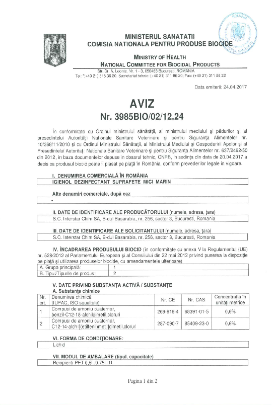 Igienol Biocid Dezinfectant fara clor Marin fresh 750 ml, avizat Ministerul Sanatatii