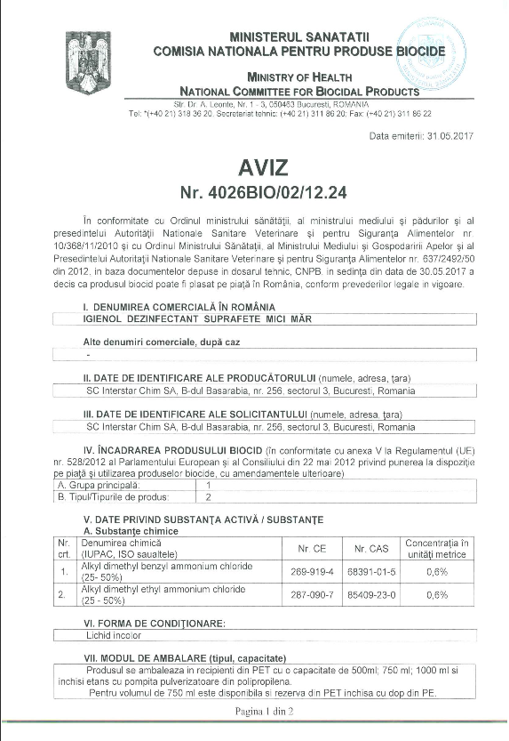 Igienol dezinfectant fara clor pentru suprafete si obiecte curata si dezinfecteaza, omorand: