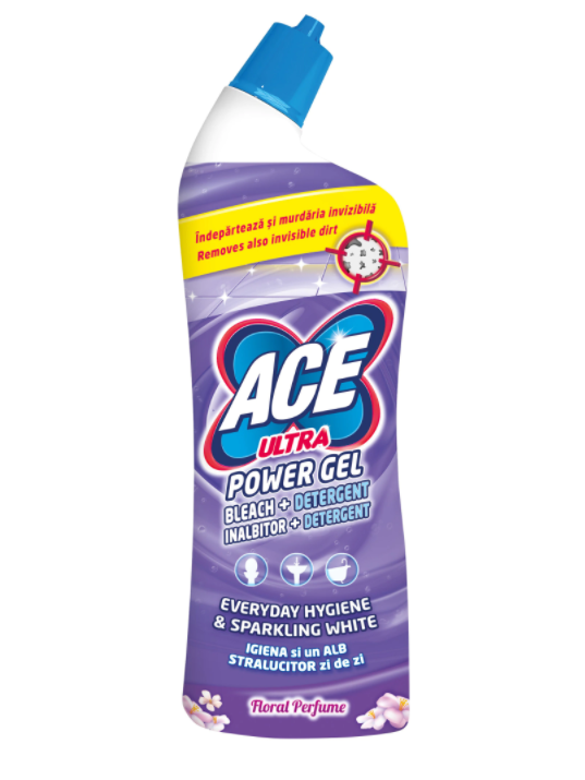 Pentru igienizarea suprafetelor din baie, a vasului de toaleta si a pardoselilor, solutia este ACE Ultra Power Gel. Datorita formulei cu clor si detergent ofera o igiena profunda si un alb stralucitor. Forma speciala a sticlei, permite accesul in zonele inguste si greau accesibile, cum ar fi marginea vasului de toaleta.