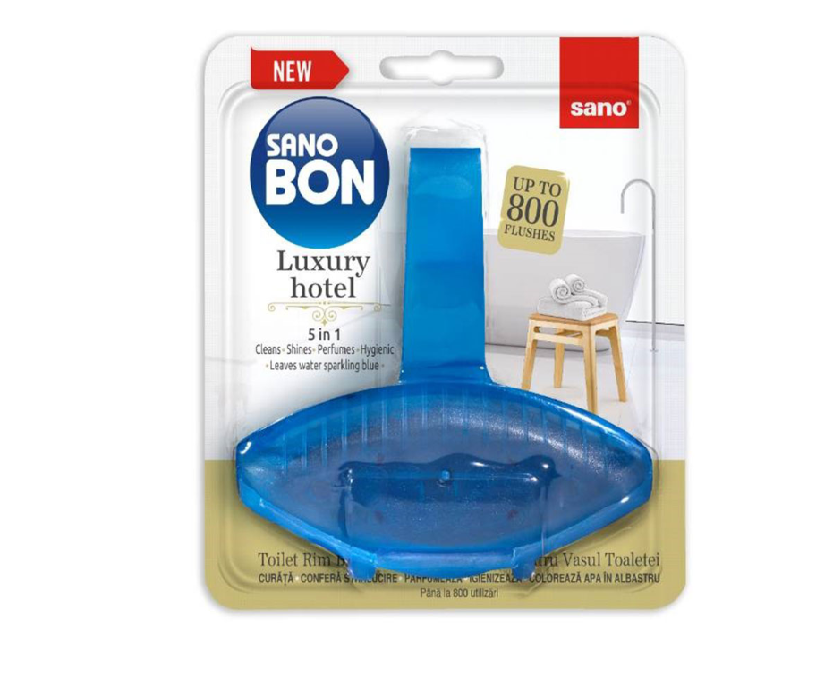 Odorizantul wc baie Sano Bon Blue Luxury Hotel 5in1 este un detergent si odorizant pentru vasul de toaleta ce curata, ofera stralucire, igienizeaza, coloreaza apa in albastru si improspateaza aerul cu parfumul unic al unui hotel de lux. Acesta contine agenti de curatare, care igienizeaza la fiecare utilizare si previne depunerile de calcar. Odorizantul are o capacitate pana la 800 de utilizari.