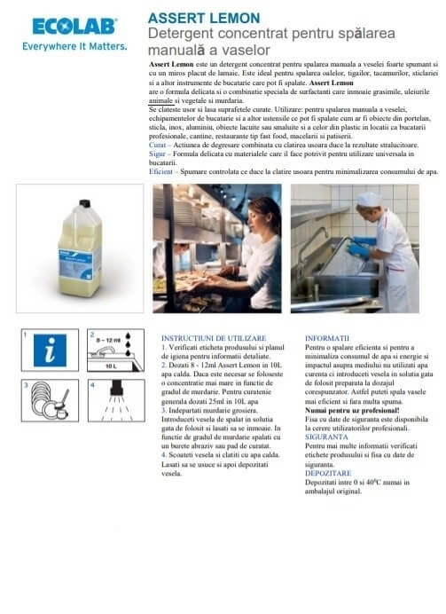 Assert Lemon este un detergent concentrat pentru spalarea manuala a veselei foarte spumant si cu un miros placut de lamaie. Este ideal pentru spalarea oalelor, tigailor, tacamurilor, sticlariei si a altor instrumente de bucatarie care pot fi spalate. Assert Lemon are o formula delicata si o combinatie speciala de surfactanti care inmoaie grasimile, uleiurile animale si vegetale si murdaria. Se clateste usor si lasa suprafetele curate.