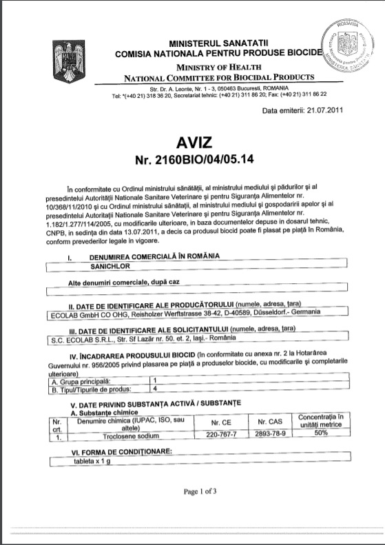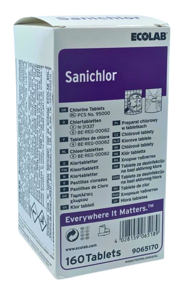 Ecolab Sanichlor Virucid Dezinfectant Tablete de clor pentru curatare suprafete bucatarie TP 4, 160 buc, avizat Ministerul Sanatatii