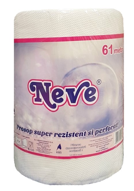 Prosop hartie Neve 2 straturi 61 metri Maxi rola de hartie pentru bucatarie Neve este din celuloza 100%, cu putere mare de absorbtie a lichidelor, de culoare alba, neparfumata si neimprimata. O rola Neve 61 metri contine 265 de foi hartie. Prosop hartie super rezistent si perforat. Numar foi : 265 foi pe rola. Numar straturi: 2. Dimensiuni: - foaie hartie : 22 cm x 23 cm; - lungime totala: 61 m. Culoare: alb.Specificatii