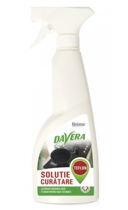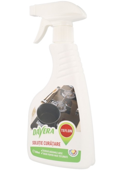 - Soluția de curățare trebuie pulverizată pe întreaga suprafață a vasului acoperit cu teflon.