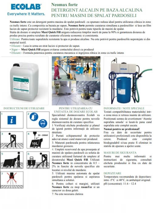Neomax Forte este un detergent pentru masina de spalat pardoseli cu spumare redusa ideal pentru utilizarea zilnica in zone cu trafic intens. Cu compozitia sa bazata pe sapun, Neomax forte permite curatarea simultana a pardoselilor si lasa un film lucios de sapun protector rezistent la murdarie. Este potrivit pentru toate tipurile de masini de spalat.
