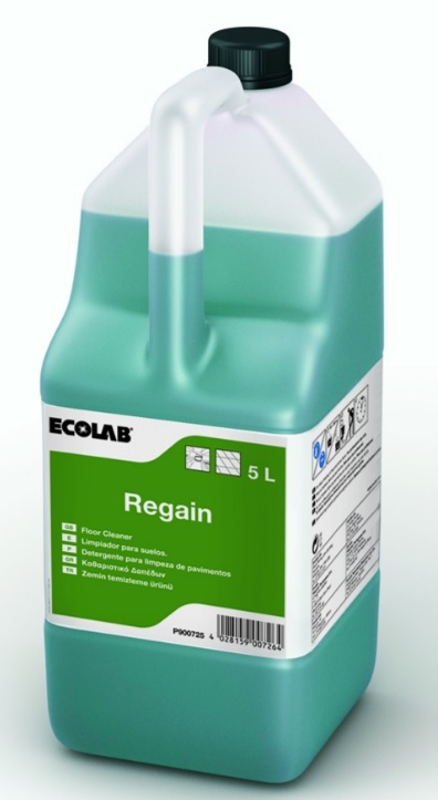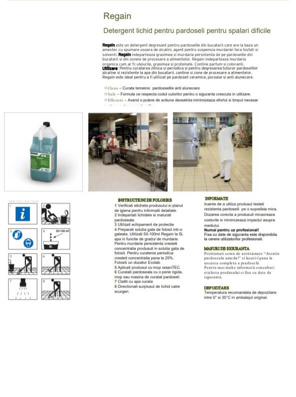 Regain este un detergent degresant pentru pardoselile din bucatarii care are la baza un amestec cu spumare usoara de alcalini, agent pentru suspensia murdariei fara fosfati si solventi. Regain indeparteaza grasimea si murdaria persistenta de pe pardoselile din bucatarii si din zonele de procesare a alimentelor. Regain indeparteaza murdaria organica cum ar fi: uleiurile, grasimea si proteinele. Contine parfum si coloranti.