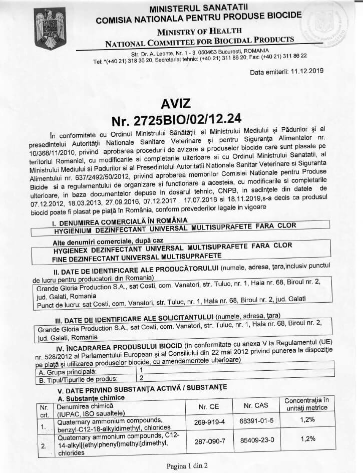 Hygienium Biocid Dezinfectant Universal suprafete, Avizat Ministerul Sanatatii, 1000 ml