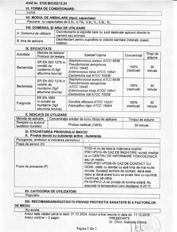 Utilizare: Produsul se va folosi pentru dezinfectarea suprafeţelor multiple (ceramică, lemn, plastic, vinilin, suprafeţe lucioase) . Nu conţine hipoclorit de sodiu.