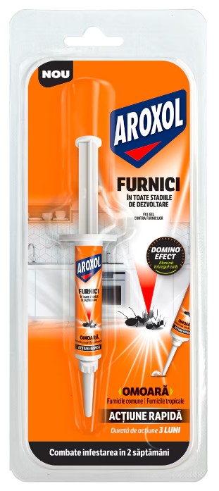 AROXOL FX3 GEL IMPOTRIVA FURNICILOR SERINGA 7G- FX3 GEL CONTRA FURNICILOR este un insecticid momeala sub forma de gel gata de utilizare in cutie momeala (PT18) care contine imidacloprid ce elimina principalele specii de furnici comune,furnicile de gradina (Lasius niger) si tropicale (Linepithema humile, Monomorium pharaonis) si cuiburile acestora.