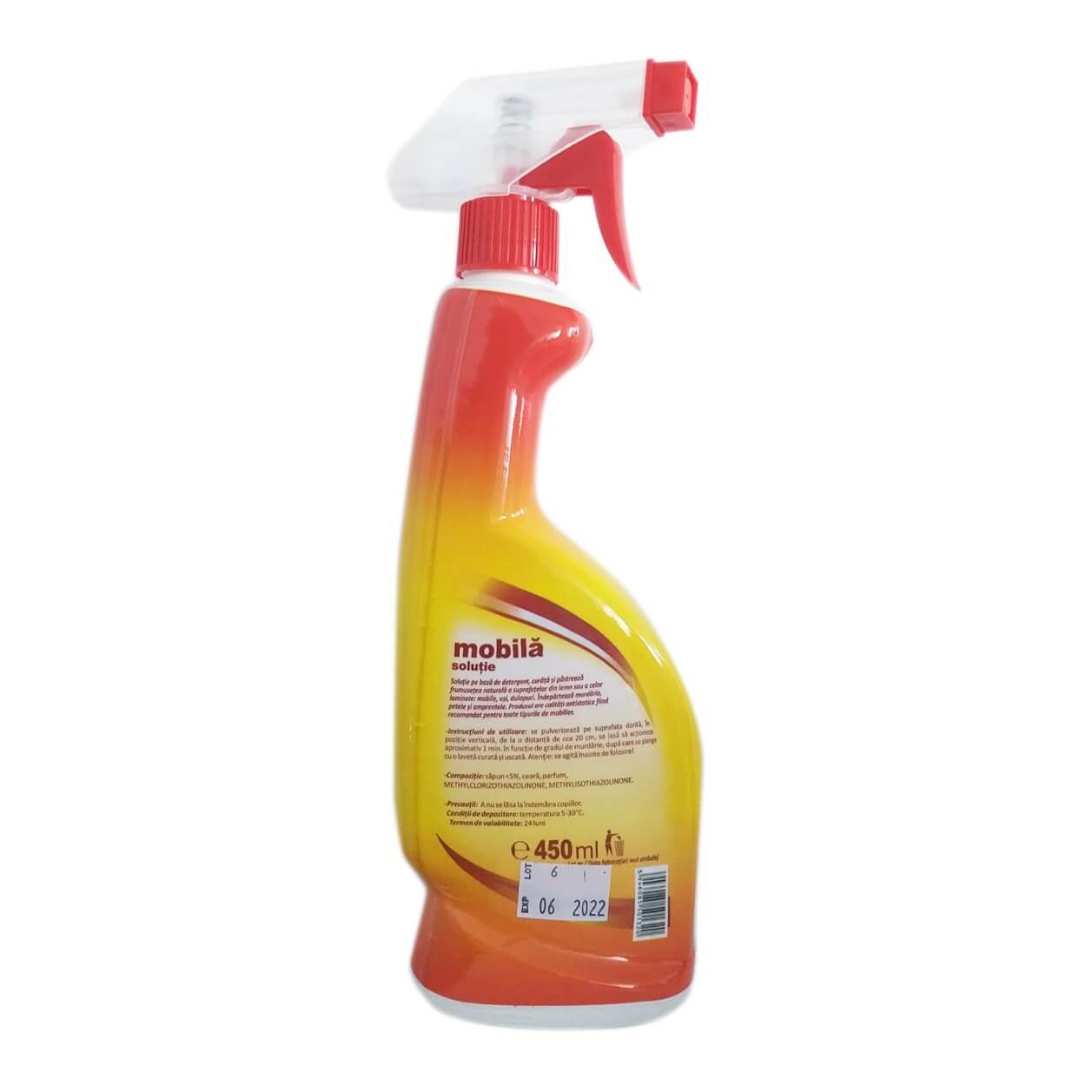 Solutie pe baza de detergent, curata in profunzime si pastreaza frumusetea naturala a suprafetelor din lemn sau a celor laminate: mobile, usi, dulapuri. Indeparteaza murdaria, petele si amprentele. Produsul are calitati antistatice, fiind recomandat pentru toate tipurile de mobilier.