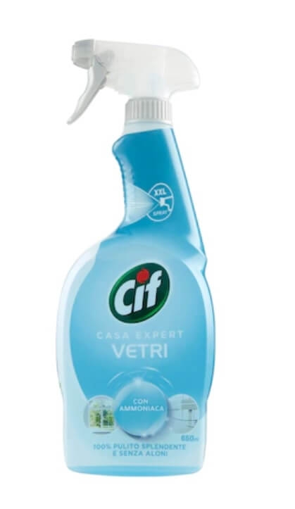 Cif pentru sticla si suprafete stralucitoare, datorita formulei imbogatita cu amoniac, degreseaza in profunzime toate suprafetele casei lasandu-le luminoase si fara urme. Poate fi utilizat pe sticla, oglinzi, mobila si rafturi, gresie si otel fara a fi nevoie de clatire. De asemenea, datorita actiunii lui anti-ceata, combate formarea condensului pe sticla mentinand-o stralucitoare mai mult timp.