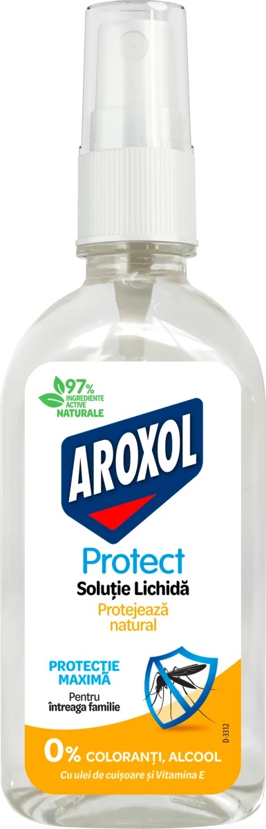 Aroxol Protect solutie lichida care o formula cu dubla actiune, bazata pe ingrediente naturale ce ofera protectie pe parcursul zilei fiind si emolient parfumat pentru suprafata corpului. Ingredientele active sunt binecunoscute atat pentru actiunea lor prelungita de aparare (timp de 5 ore) impotriva intepaturilor dar si pentru beneficiile lor asupra pielii: Uleiul de cuisoare - are un miros puternic care poate sa afecteze receptorii sensibili ai insectelor si sa-i tina la mare distanta de locul protejat.