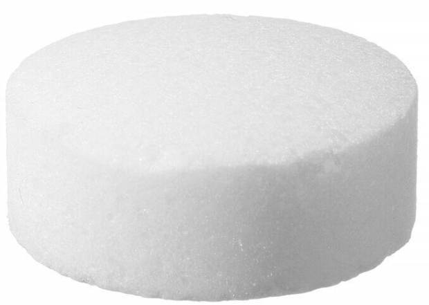 Confectionata din sare comprimata - compozitia materiei prime este doar clorura de sodiu NaCl.