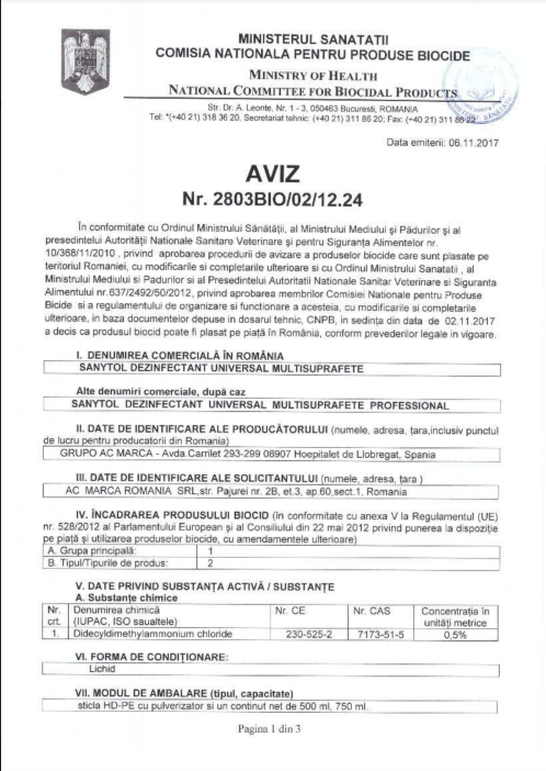 Sanytol Virucid Dezinfectant universal cu parfum de grapefruit 500ml, avizat Ministerul Sanatatii