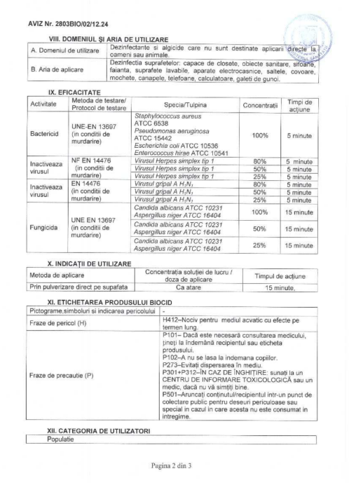 TP2: Produse utilizate pentru dezinfectarea suprafețelor, materialelor, echipamentelor și mobilierului și care nu sunt utilizate în contact direct cu produsele alimentare sau cu hrana pentru animale. Sunt în special destinate piscinelor, acvariilor, apelor de bazin sau altor ape; sistemelor de climatizare; și pereților și podelelor din amplasamente private, publice și industriale și din alte amplasamente destinate activităților profesionale.