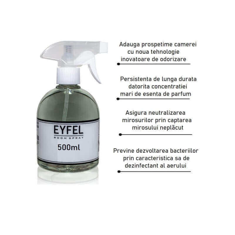 EYFEL Spray 500 ml este un parfum creat special pentru: mobilier tapisat, perdele, mochete-covoare, lenjerii, prosoape, haine curate.