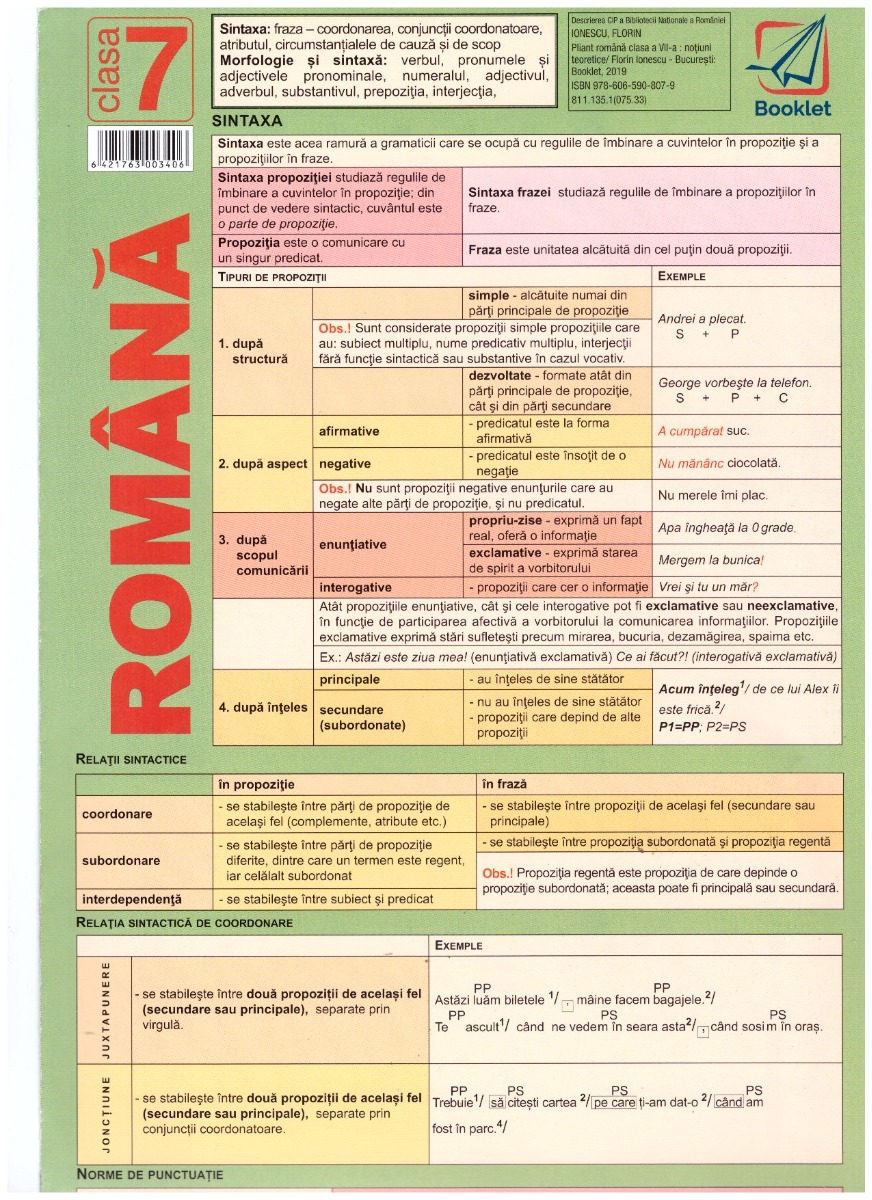 Pliantul cuprinde principalele notiuni de clasa a VII-a, impartite in doua mari sectiuni: Sintaxa si Morfologia si sintaxa. Sintaxa cuprinde urmatoarele titluri: Tipuri de propozitii si Relatii sintactice, iar sectiunea Morfologie si sintaxa contine: Verbul, Substantivul, Pronumele – nehotarat, negativ, interogativ, relativ, de intarire, reflexiv – Numeralul, Adjectivul, Adverbul, Interjectia, Prepozitia, Conjunctia.