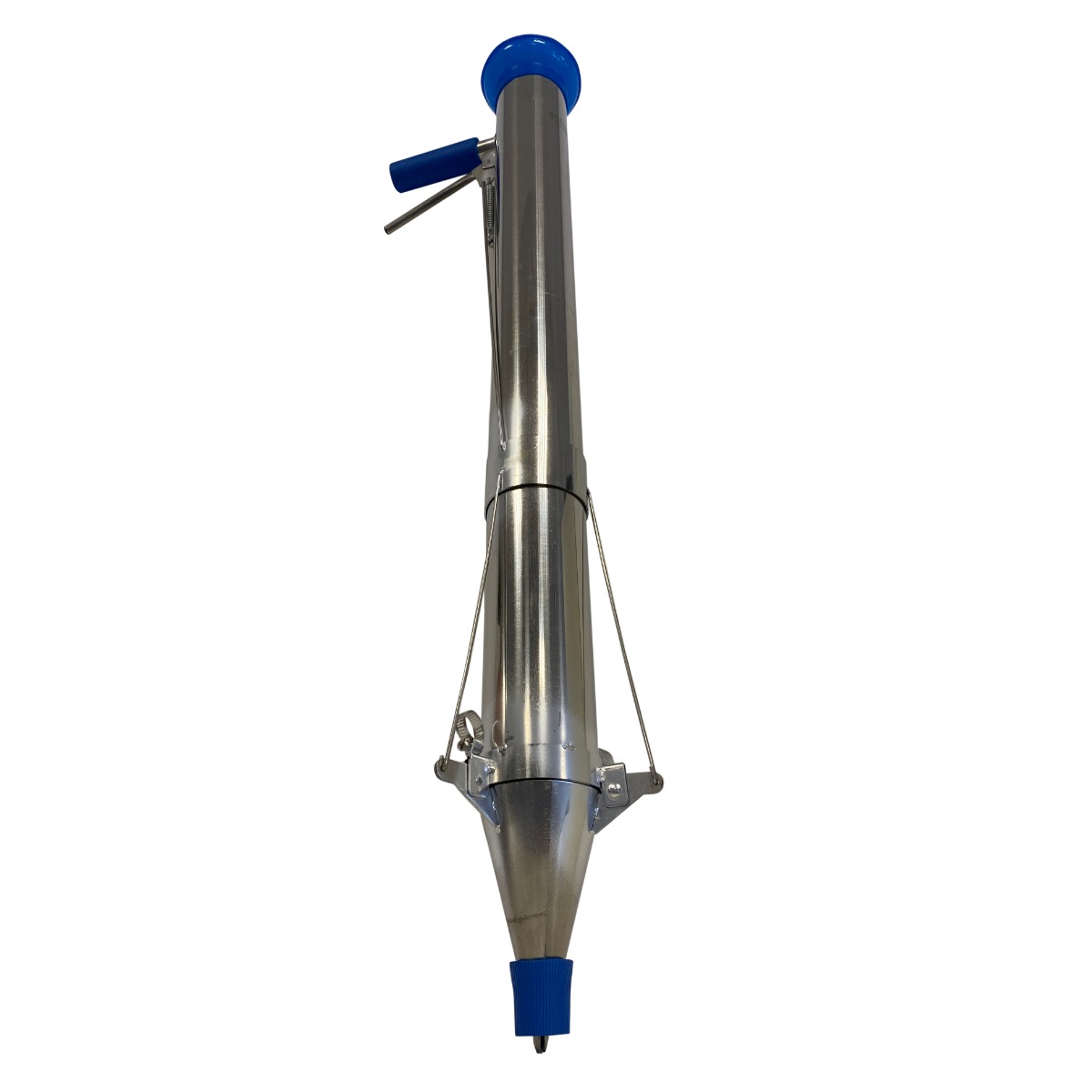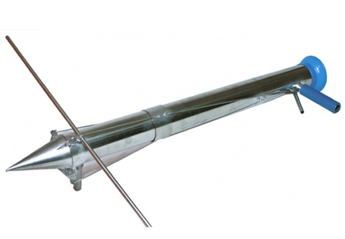 Plantator manual pentru rasaduri din material inoxidabil cu tub de directionare si o supapa care automatizeaza procesul de plantat rasaduri.
