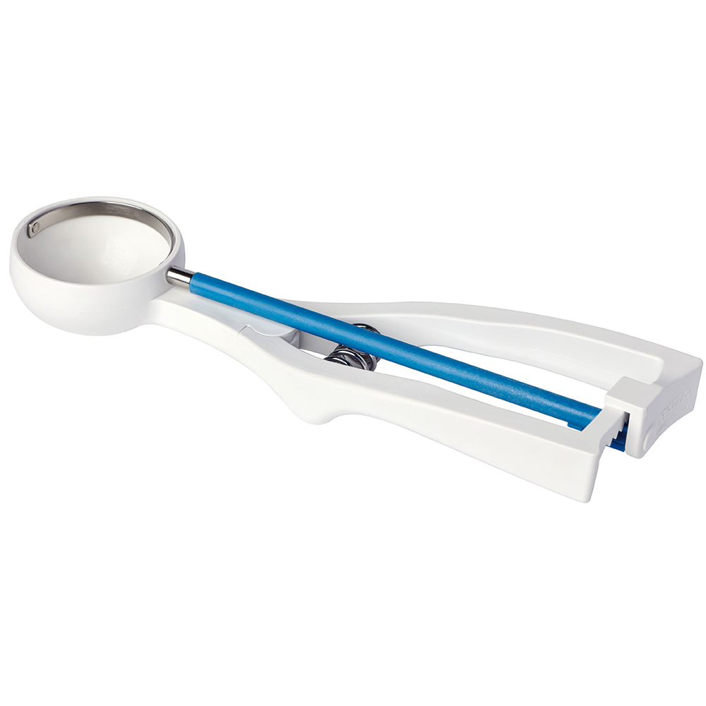 Portionator inghetatata, material: polimer special cu rezistenta la temepratura intre -30grC si +170grC, pretabil pentru masina de spalat vase, respecta standardele EEC si FDA, lama si arcul din inox, manerul este ergonomic cu suprafata mata, antialunecare; axul central are culoare albastraSpecificatii