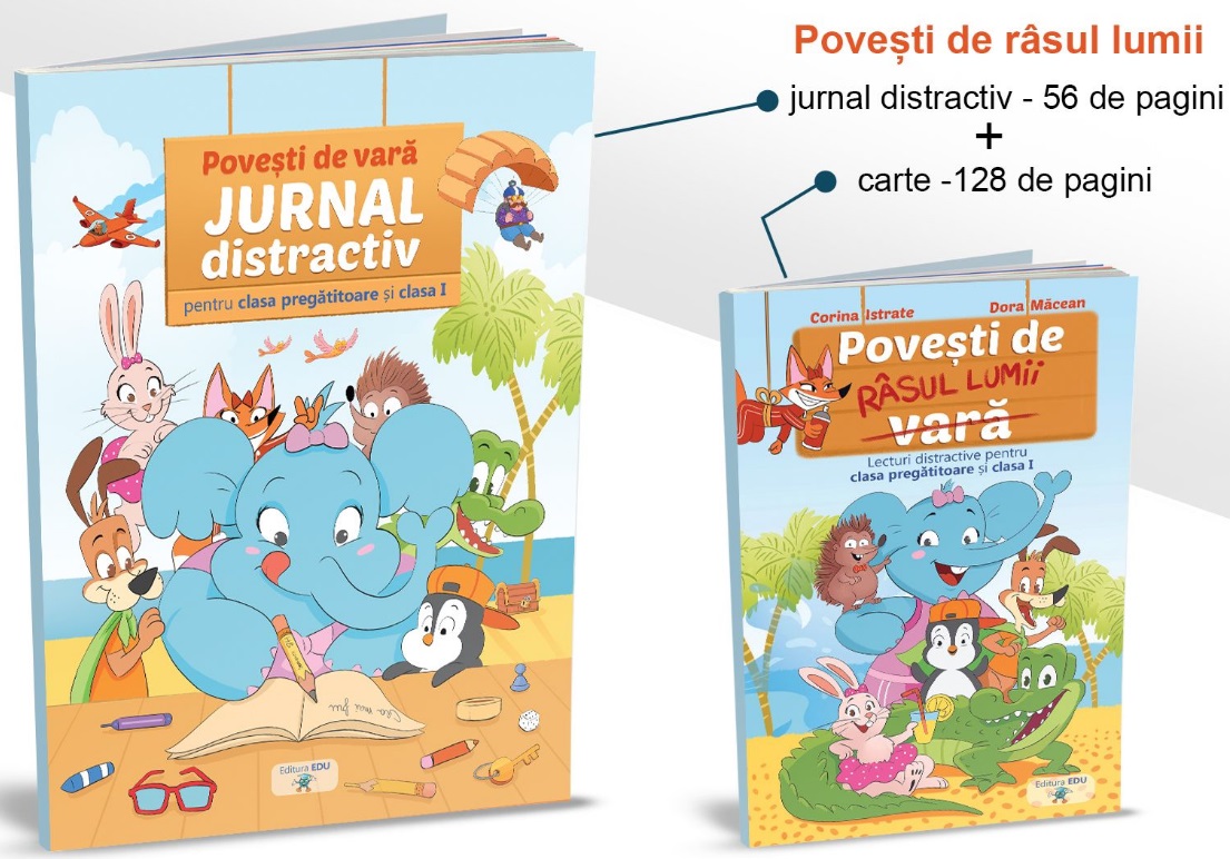 Am pregatit pentru vacanta de vara pachetul educational ”Povesti de vara”, format dintr-o carte amuzanta Povesti de rasul lumii (128 de pagini color, marime 20, 5 x 13 cm) si Jurnalul distractiv (56 de pagini color, 27, 5 x 21 cm). Se adreseaza elevilor din clasa pregatitoare.
