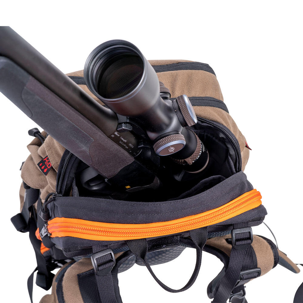 Rucsacul de vânătoare este extrem de silențios și hidrofug, precum și foarte robust și rezistent. Spațiul de depozitare extins este asigurat de buzunare cu fermoar protejate de apă, buzunarele interioare și clapa capacului. Telefonul dvs. mobil, dispozitivul GPS sau documentele importante sunt, de asemenea, protejate de umiditate. Buzunarele laterale oferă spațiu pentru o sticlă de apă sau alte echipamente care trebuie să fie accesate rapid. Rucsacul are un volum total de 43 litri.