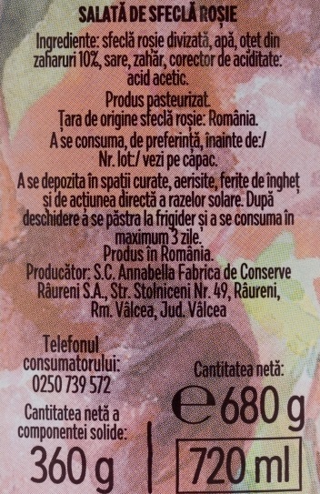Ingrediente: Sfeclă roşie, apă, oţet din vin alb, sare, zahăr.