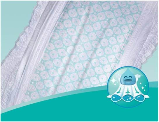 * Stratul Extra Dry absoarbe rapid lichidul chiar daca bebelusul tau sta in diferite pozitii. In acelasi timp, acesta actioneaza si ca o bariera suplimentara in fata revenirii umezelii in contact cu pielea bebelusului.