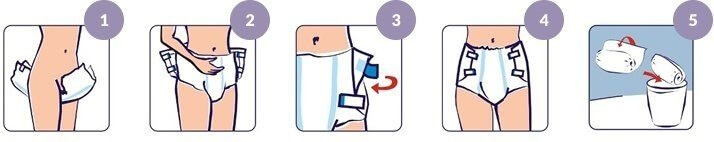 Indicatorul de umiditate ofera informatii despre necesitatea schimbarii produsului, iar inscriptia FRONT indica partea din fata a chilotului.