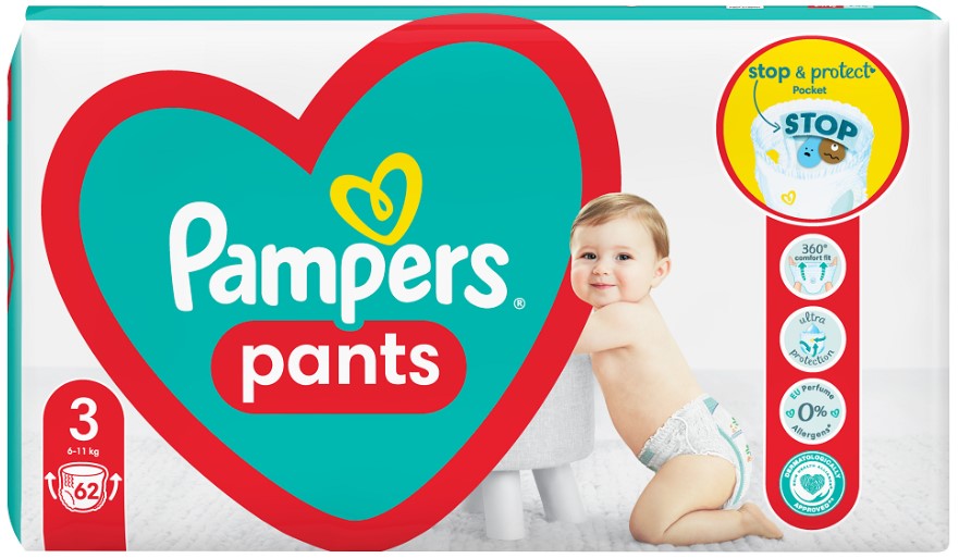 Scutecele-chilotel Pampers Pants sunt primele scutece-chilotel cu buzunar Stop & Protect.