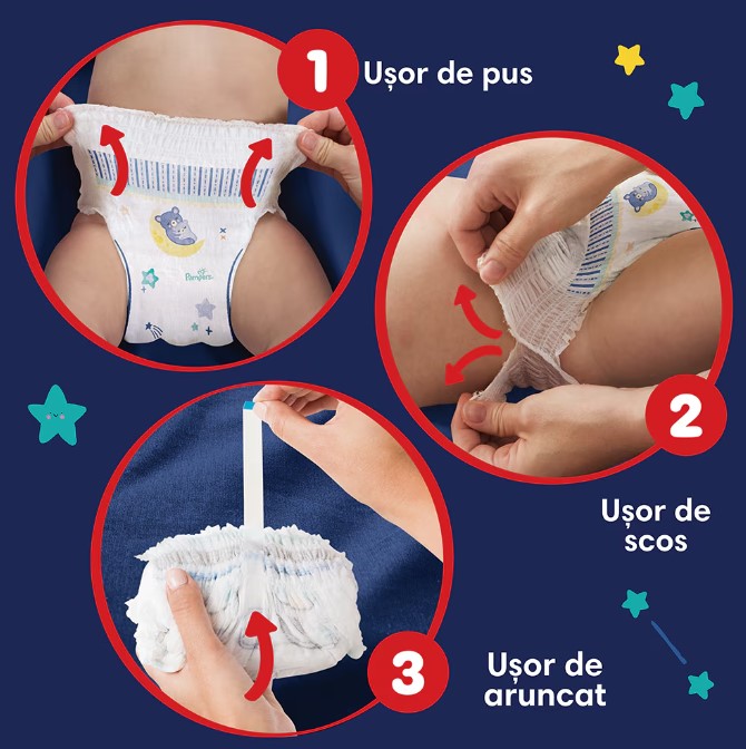 Ofera-i bebelusului cea mai buna protectie pe timpul noptii cu scutecele-chilotel Pampers Night Pants ce datorita fixarii de jur imprejur se adapteaza miscarilor nocturne ale acestuia.