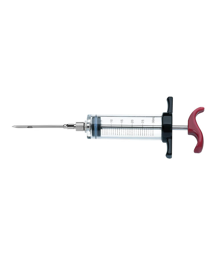 Seringa pentru sos, capacitate 30 ml; corp din material acrilic si ABS; acul si pistonul sunt fabricate din inox; lungime totala 216 mm.