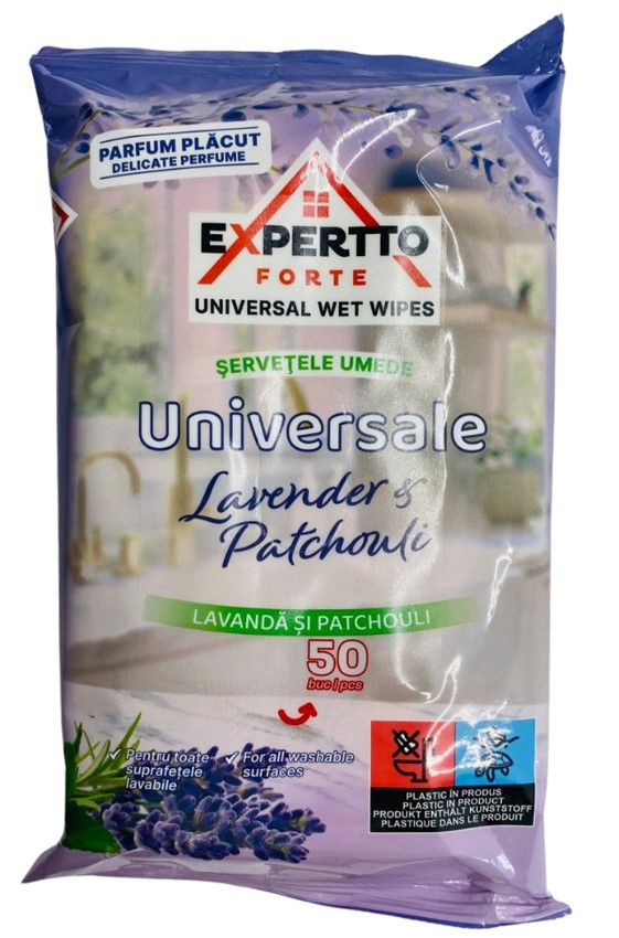 Servetele umede Lavander & Patchouli, 50 buc Expertto - Pentru toate suprafetele lavabile - Curata rapid suprafetele - Parfum proaspat si placut - Ideale pentru calatorieSpecificatii