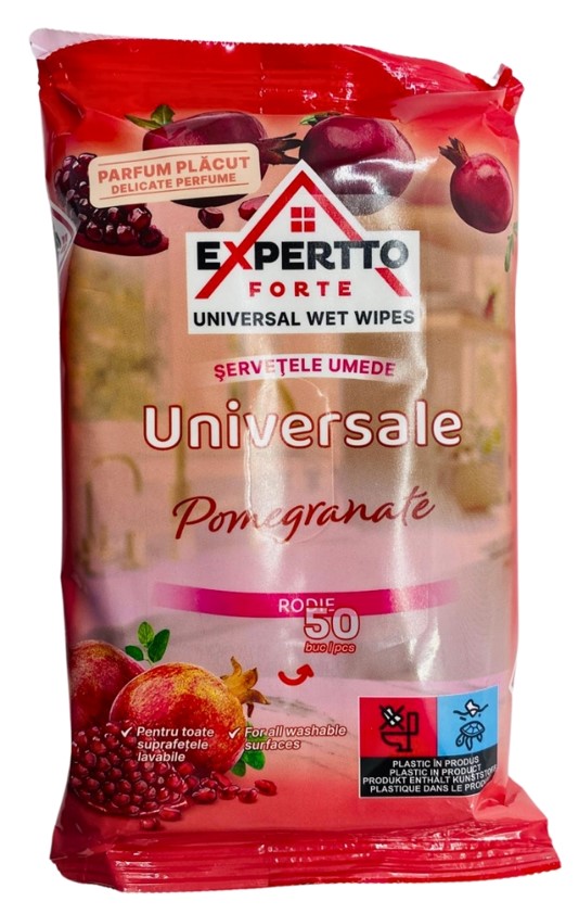 Servetele umede Pomegranate, 50 buc Expertto - Curatare rapida a suprafetelor - Pentru toate suprafetele lavabile -Parfum fresh si delicatSpecificatii