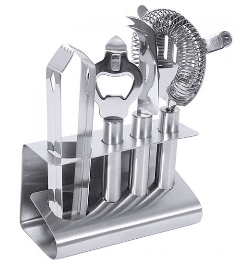 Set 5 ustensile pentru barman, compus din: suport + strecuratoare cocktail + cleste + desfacator sticle + cutit, inox 18/10 cu finisaj lucios, dimensiuni 130x70x170mm