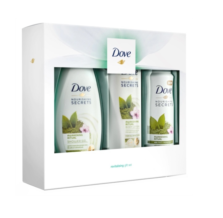 Noul gel de dus Dove Nourishing Secrets Awakening Ritual iti revigoreaza simturile datorita mirosului racoritor si bogat al matchei, in timp ce notele subtile de ulei de floare de cires racoresc pielea. Aromele naturale de flori si ceai asigura o experienta desavarsita, iar formula Dove cu ¼ crema hidratanta si fara sulfati SLES curata delicat pielea.