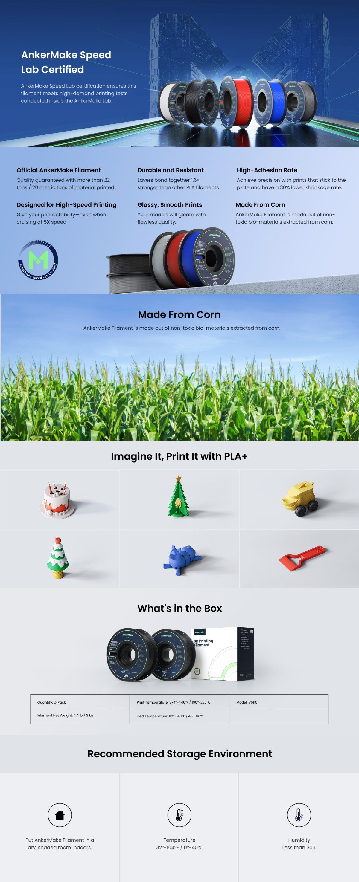 Filamentul AnkerMake este fabricat din biomateriale non-toxice extrase din porumb.Obtineti precizie cu amprente care adera la placa si au o rata de contractie cu 30% mai mica.