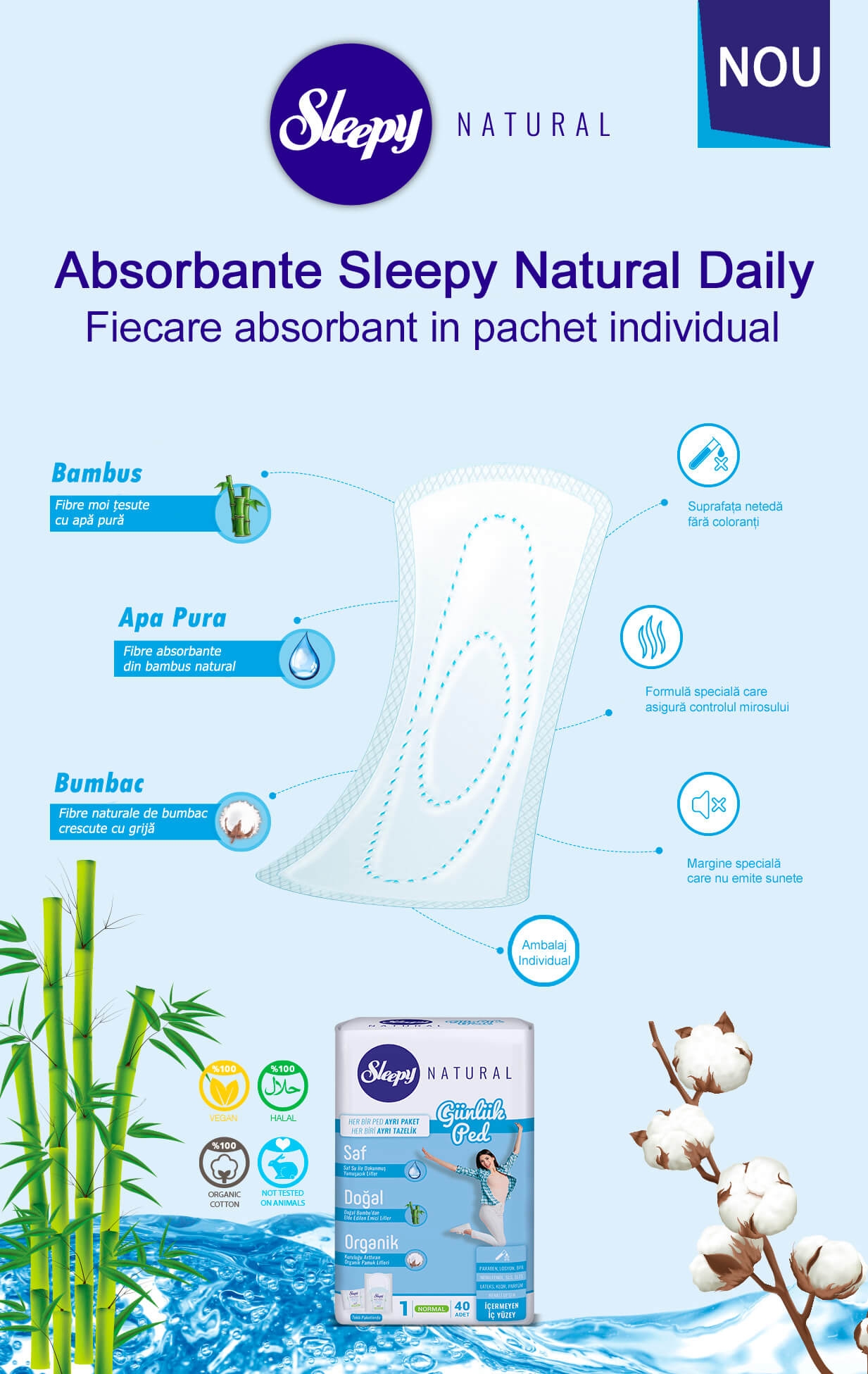 Absorbantele Sleepy Natural sunt create din fibre de bambus pentru a asigura un confort maxim pentru pielea dumneavoastra delicata zilele speciale.